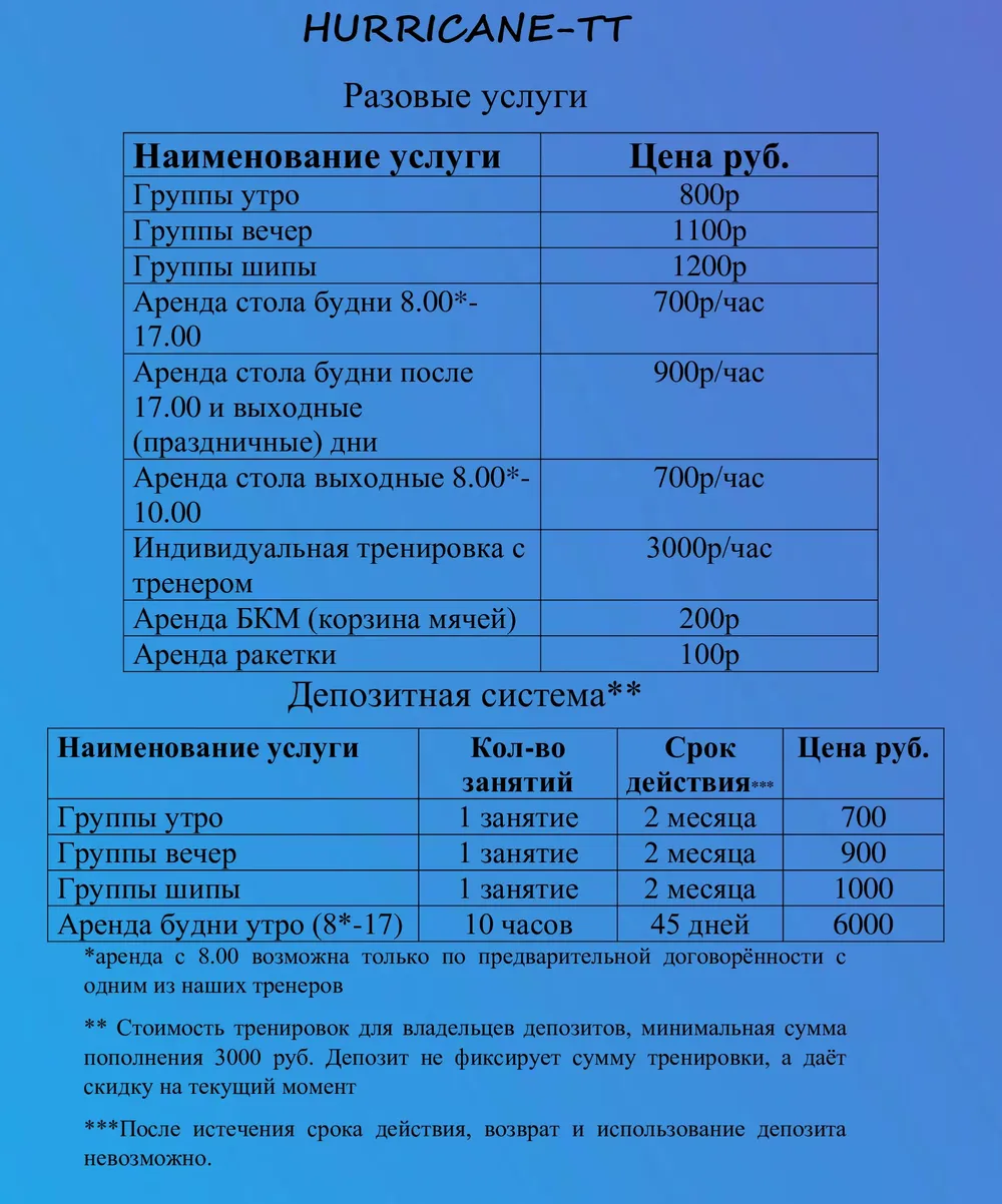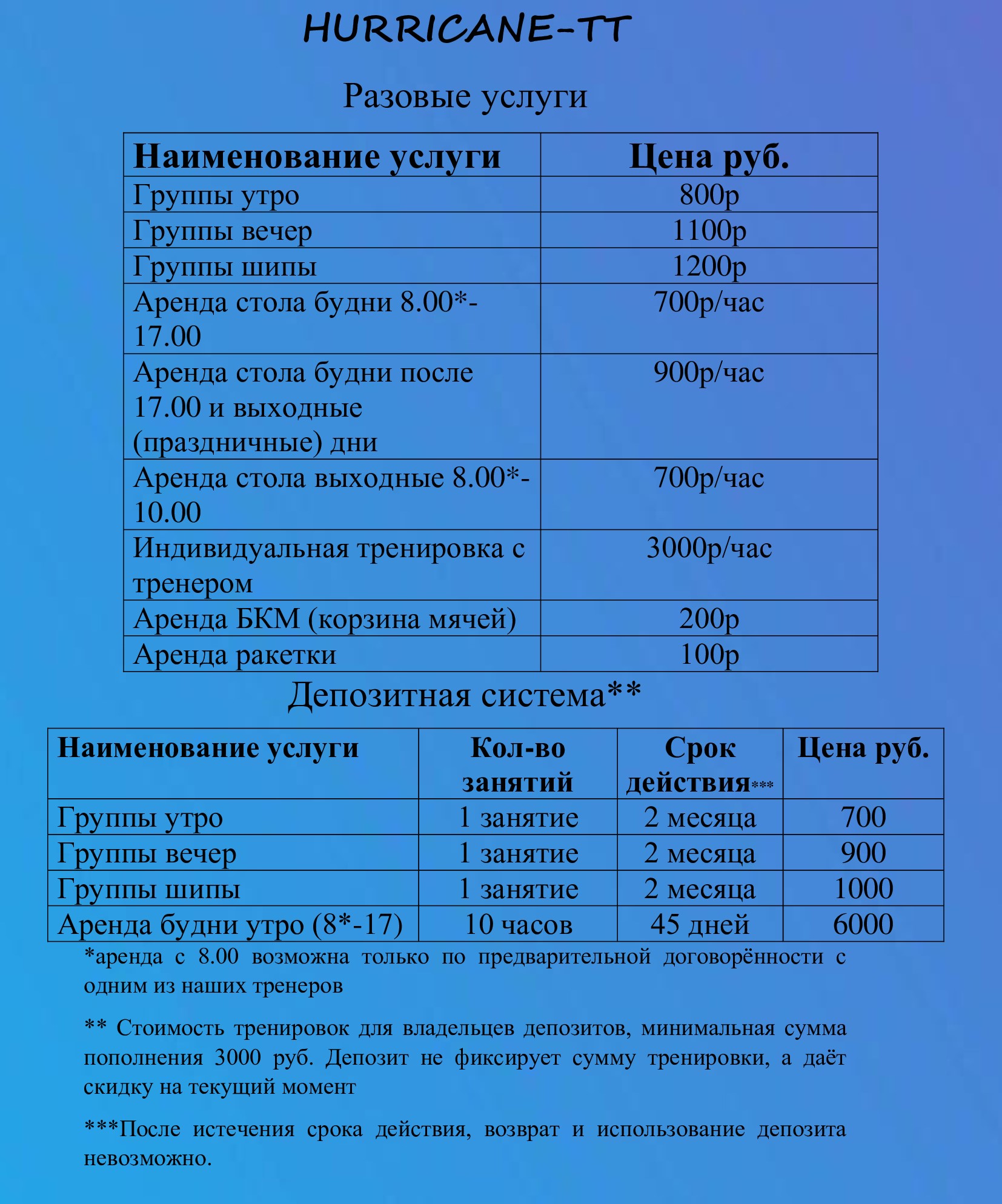 Клуб настольного тенниса Hurricane-TT! Проведение индивидуальных и групповых тренировок, проведение корпоративных тренировок и турниров, проведение любительских турниров, аренда столов, чтобы просто поиграть в теннис, а также магазин инвентаря для настольного тенниса, подбор готовых ракеток, а также сборка профессионального инвентаря